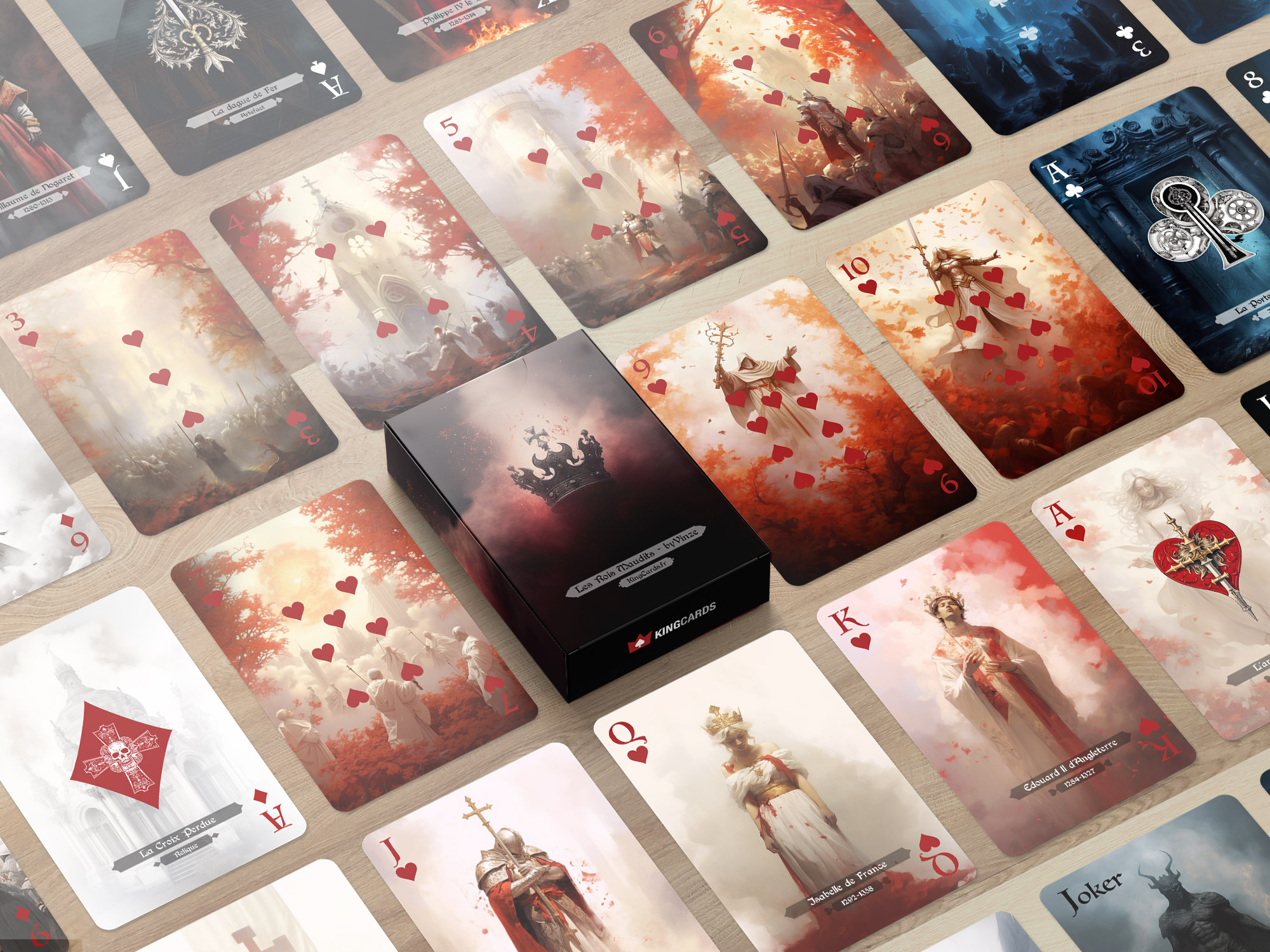 Plongez dans des univers enchanteurs et explorez des mondes imaginaires à travers nos jeux, dont le fameux poker « Les rois maudits » réalisé par Vinze, inspiré de l’oeuvre de Maurice Druon. Naviguez également sur notre blog pour découvrir les coulisses de ces créations, les règles fascinantes, et des promotions exclusives. Optez pour Kingcards®, où l’art et le jeu se rejoignent pour une expérience incomparable.